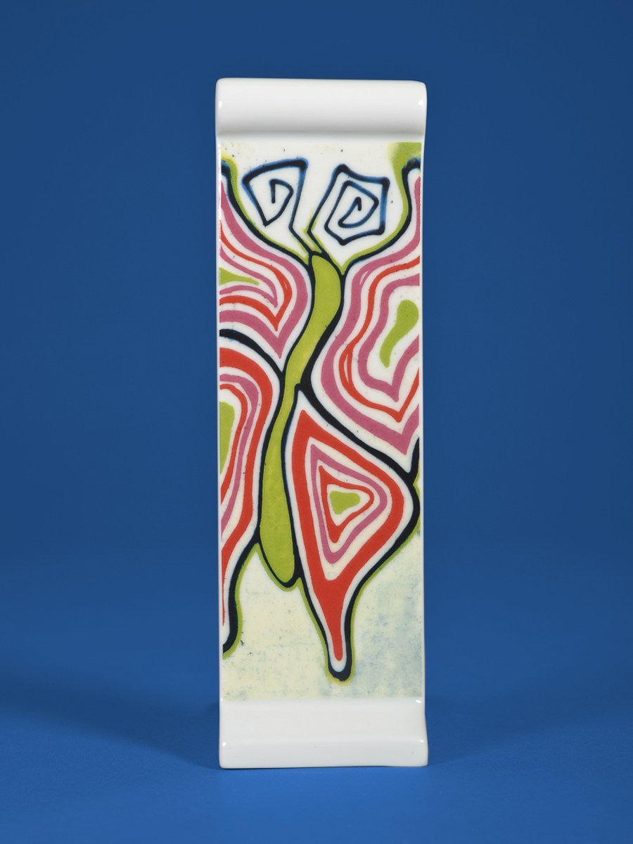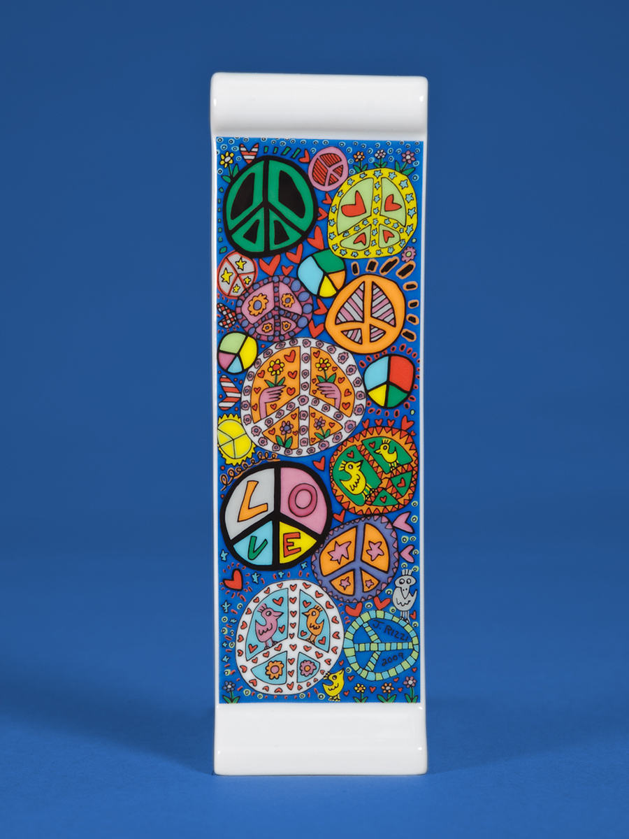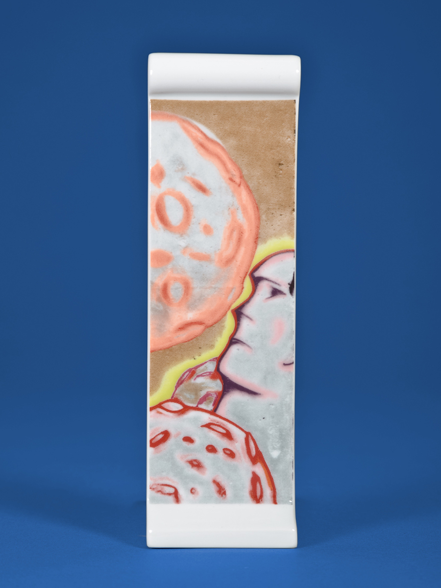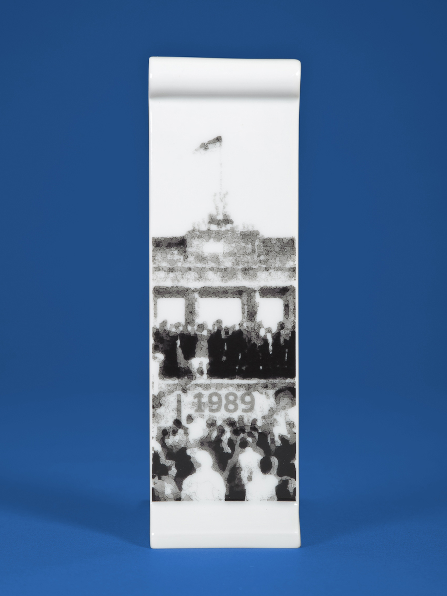 The peaceful, persistant movement of East German citizens, celebrating the opening of the Berlin iron curtain on top of the concrete wall. A subtle collage of photography and porcelain.