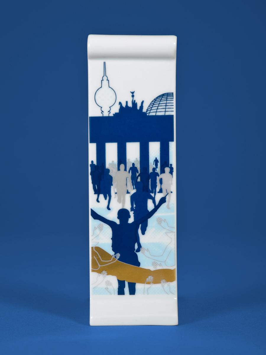 2009 is a peculiar year for Berlin: First the Athletics World Championships, and then the 20. anniversary of the peaceful revolution 1989. This sculpture is painted with one of the highlights of the Athletics World Championships, the marathon running through the Brandenburger Tor.