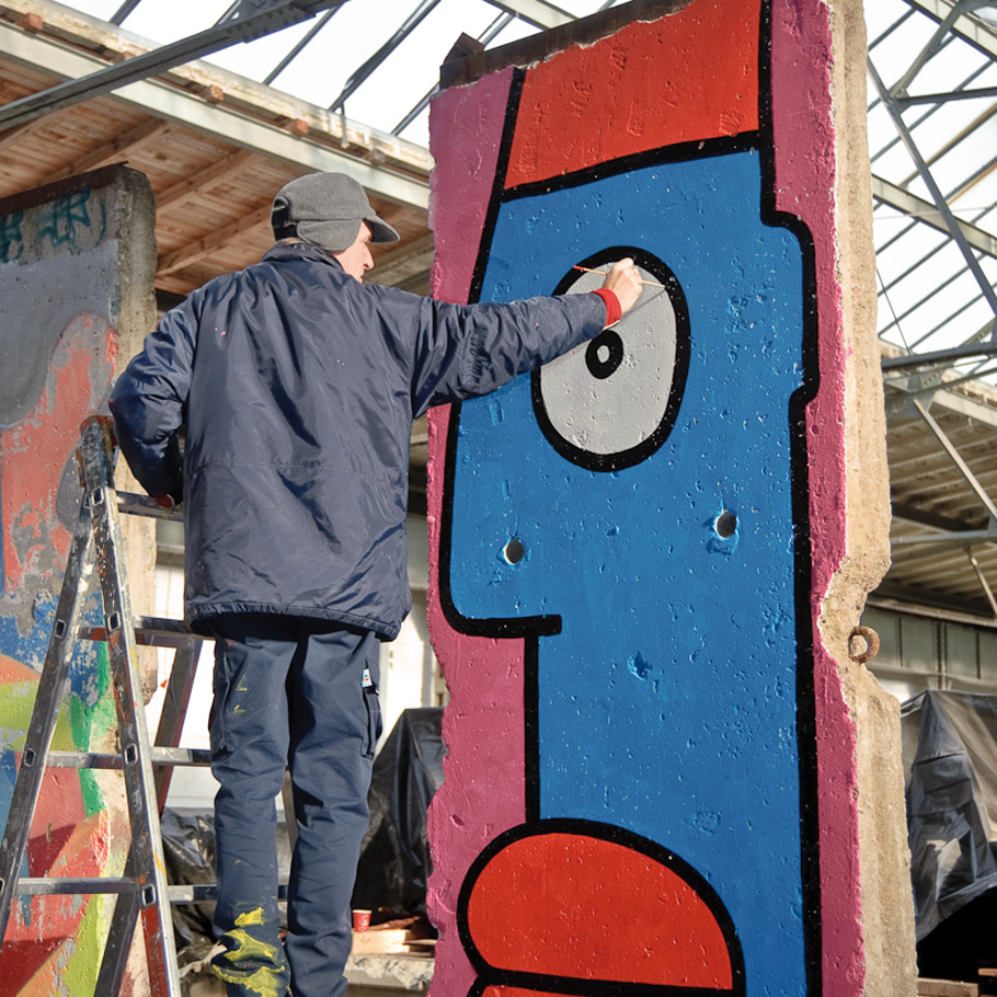 His design language is legend. On account of the anniversary of the fall of the Berlin Wall Thierry Noir exclusively created this unique motive on an L-shaped Berlin Wall element.
